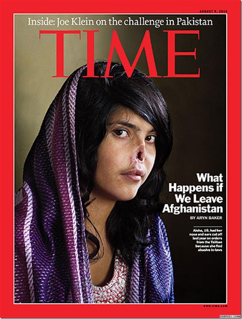 20歲的碧比·愛莎,從12歲嫁人的那天起就一直挨丈夫的打。後來丈夫越發兇暴,她覺得可能會被打死,就跑出家門向鄰居求助。他丈夫是個塔利班戰士,為了懲罰她不經允許離家,把她帶進山里。幾個男人按住她,他割去了她的鼻子、耳朵和頭髮。她尖叫,卻無人來救。愛莎今年8月去美國接受大範圍整容手術。