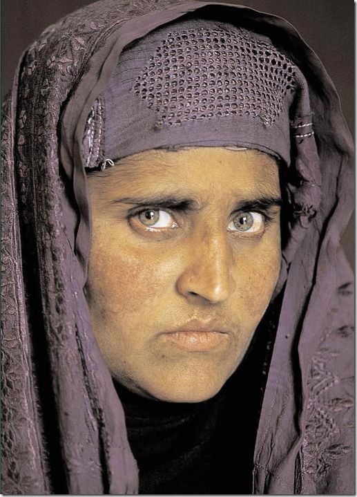 她這輩子只拍過兩次照片:第一次是十七年前,攝影師史提夫.麥凱瑞(Steve McCurry)在巴基斯坦邊境的阿富汗難民營裡,捕捉到她懾人的綠色雙瞳中,對無情戰火的驚懼與控訴。這幀照片在一九八五年六月登上美國《國家地理》雜誌封面,不知名的少女頓時成了阿富汗難民的象徵。
